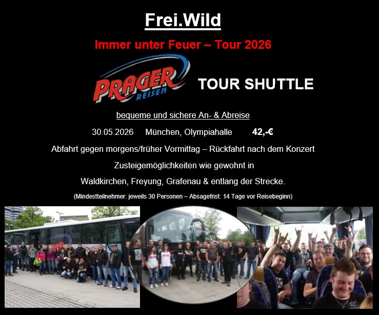 Erleben Sie eine unvergessliche Konzertfahrt zur Frei.Wild – Immer unter Feuer Tour 2026! Am 30. Mai 2026 bringt die Erfolgsband die Münchner Olympiahalle zum Beben – mit energiegeladenen Songs, gewaltiger Bühnenpräsenz und einer Show, die Fans garantiert begeistert. Wir bringen Sie bequem und stressfrei mit dem Bus nach München und wieder zurück.