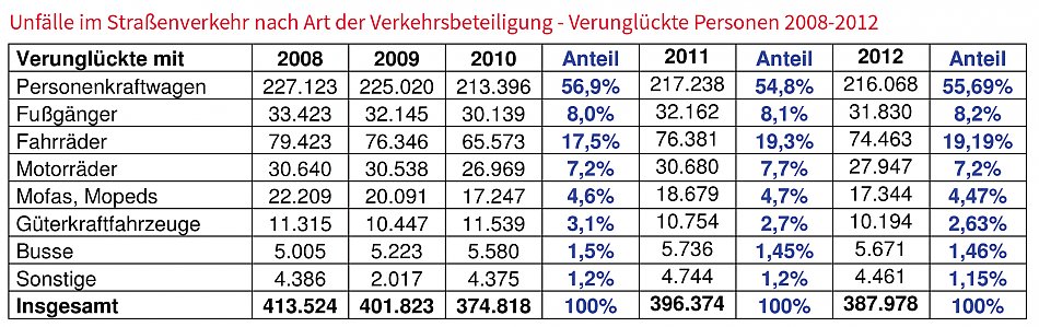 Anfang September hat das Statistische Bundesamt die Zahlen der Straßenverkehrsunfälle 2012 präsentiert. Überzeugender Sieger in puncto Sicherheit mit großem Abstand: der Buss. Mit nur drei Verkehrstoten (0,08 Prozent) im vergangenen Jahr schneidet er noch vor Moped/Mofa ( 93 /3 Prozent), Lkw (154/4 Prozent), Fahrrad (406/11Prozent), den Fußgängern ( 520 / 15 Prozent), dem Motorrad (586/16 Prozent) und weit vor dem Pkw mit 1791 getöteten Personen (50 Prozent) ab. Auch bei der Gesamtzahl der Verunglückten im Straßenverkehr belegt der Bus den besten Platz. Obwohl in einem Omnibus weit mehr Personen befördert werden als in allen anderen Straßenverkehrsmitteln, verunglückten im Jahr 2012 im Bus nur 5,671 Personen (1,46 Prozent). Spitzenreiter ist auch hier der Pkw mit 216.068 Personen (55,69 Prozent), gefolgt vom Fahrrad mit 74.463 ( 19,19 Prozent).