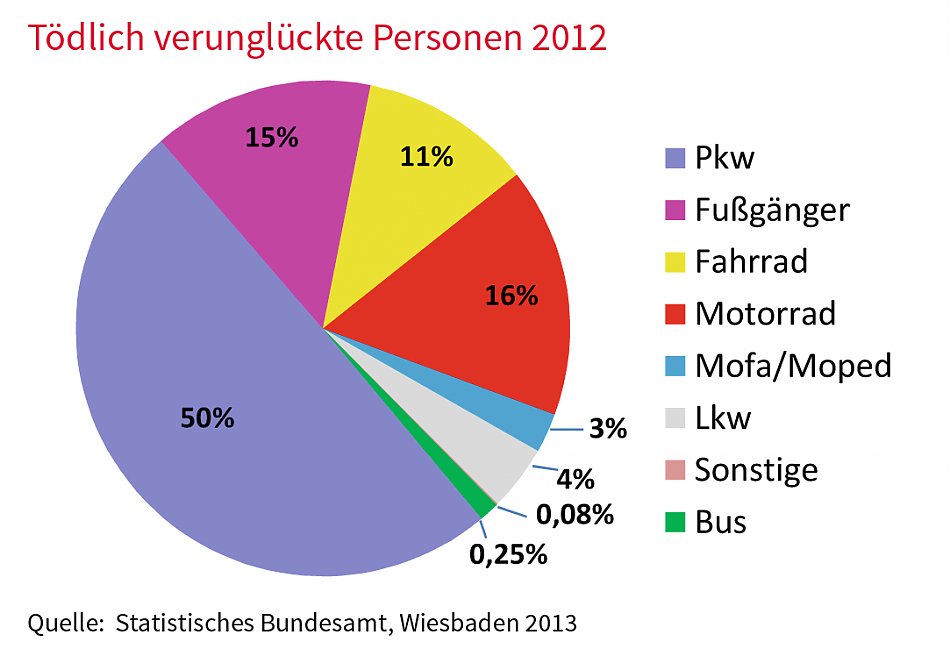 Auch die Zahl der tödlich Verunglückten ist 2012 beim Omnibus am niedrigsten. Nur 0,08 % aller im Jahr 2012 getöteten Straßenverkehrsteilnehmer verunglückten mit dem Bus.
