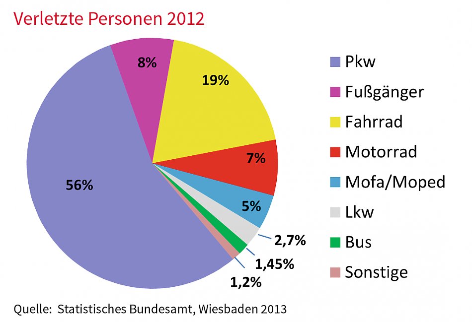 Mit einem Anteil von nur 5,6 % am gesamten Straßenverkehrsunfallgeschehen ist der Schulbus neben öffentlichen Bussen (2 %) und Bahnen (0,6 %) die sicherste Alternative für den Schulweg. Die mit Abstand häufigsten Straßenverkehrsunfälle in der Schülerunfallversicherung waren mit 49,3 % erneut die Fahrradunfälle. Im Jahr 2013 waren es 26.085 Unfälle. Weitere Unfälle haben sich als Pkw-Fahrer bzw. –Mitfahrer (18,9 %), bei der Nutzung von motorisierten Zweirädern (7 %) und als Fußgänger (10 %) ereignet. Insgesamt haben sich 2013 52.915 Straßenverkehrsunfälle in der Schüler- Unfallversicherung ereignet (2012: 50.485 Unfälle).